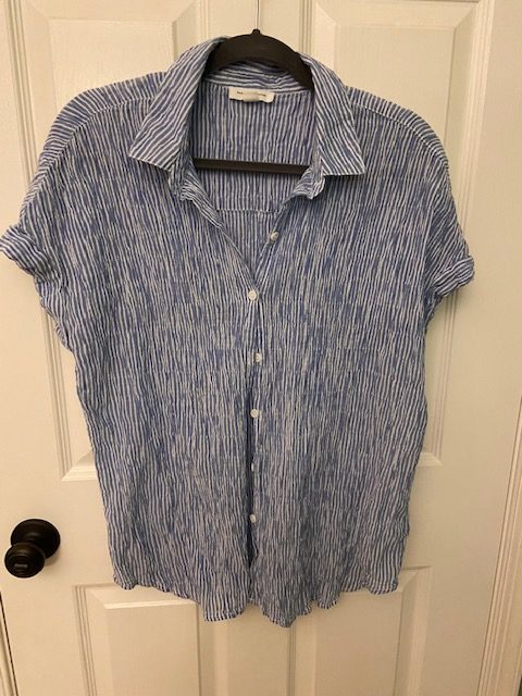 I went into the store with a thrift list and one item was a short-sleeve, button up shirt in a neutral color/print that I could tie over dresses. I actually found a bunch of options, but decided to go with this blue striped version from BeachLunchLounge. I’m familiar with the brand because I see it often when shopping at TJ.Maxx or Nordstrom Rack. I’m pretty sure this is the Spencer Shirt, which is still being sold on their website for $58. The fabric is fun and crinkly and it looks fantastic knotted.