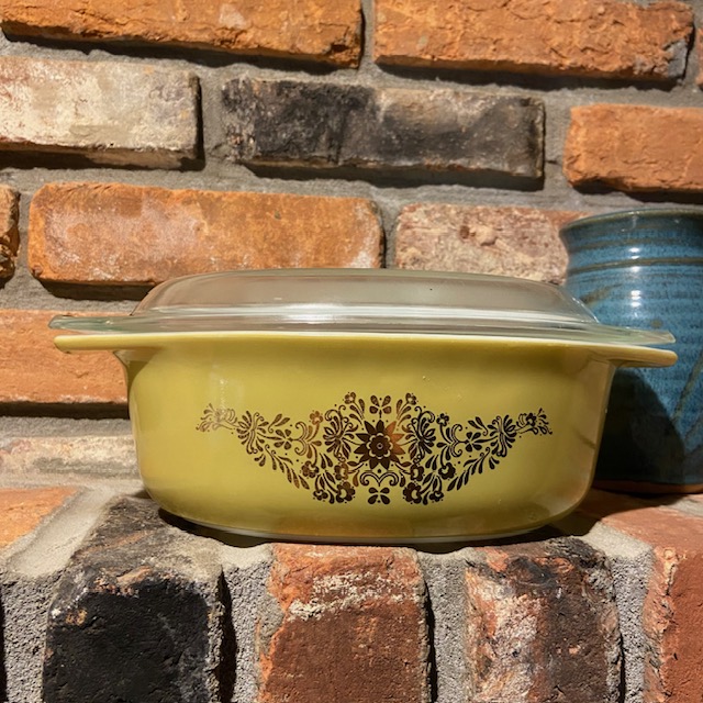 OHMYGOSH, love this little casserole dish so much! It is the Golden Garland Pyrex dish and it was a special promotional item released the winter of 1969. I was shocked at what great condition it is in and the fact that the lid wasn’t misplaced over the past 50+ years.