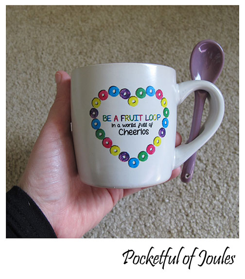 How adorable is this coffee mug?! I love the idea of being a fruit loop in a world of cheerios and the attached spoon is super cute too. However, it’s kind of small to meet my super-sized caffeine needs. Also living with Jack, both my husband and I have learned that travel mugs are the only way to enjoy coffee without having it randomly splashed on us. This one will work out great for a Jack ice cream mug though and I’m sure he will love the little purple spoon!