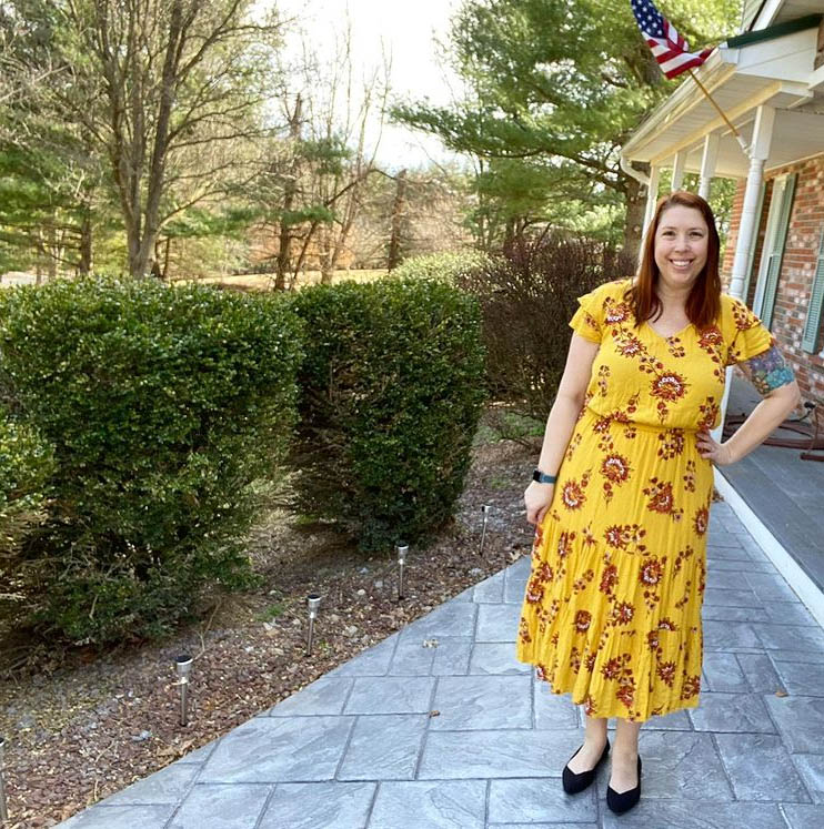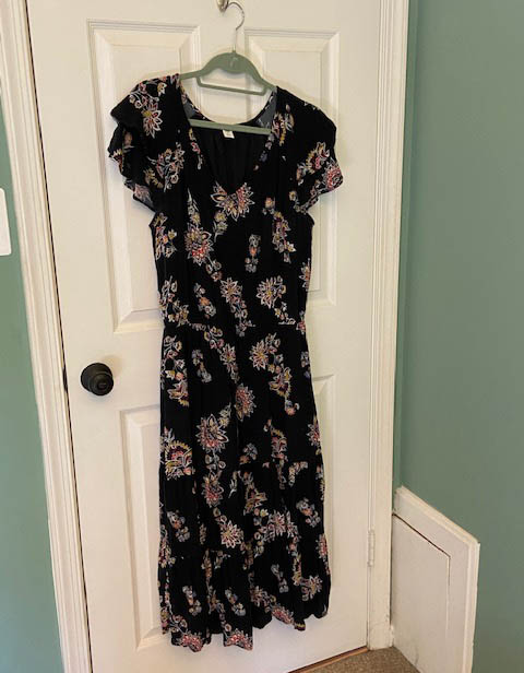 Off I went to my doctor’s appointment and as I was waiting there alone in a room wearing nothing but socks and a paper robe, I decided to waste some time by perusing Poshmark. I used a few different search terms including: Old Navy dress, Old Navy midi dress, and Old Navy tier dress and within a few minutes I found 2 of the dress I was looking for in a size large! One on the sellers had the dress available in both the black pattern and a yellow pattern, so I bundled them together and sent an offer for $38. And she accepted!