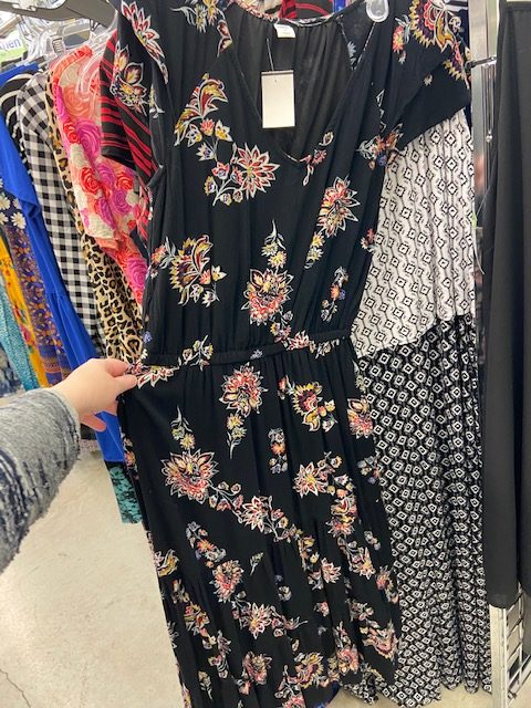 When I was on my quick browse of the thrift store, I saw a dress that caught my eye. I normally don’t bother with Old Navy because it’s pretty inexpensive to buy it new and it doesn’t typically hold up well in the long term. However, this dress had a nice fabric that didn’t seem to pill easily and even had a built-in slip. I loved the print too… the only problem was that it was a medium and my boobs typically require a large. It was marked awfully high for the thrift store at $19.99 and the fitting rooms are closed, so I decided to pass and took a quick photo before I left.