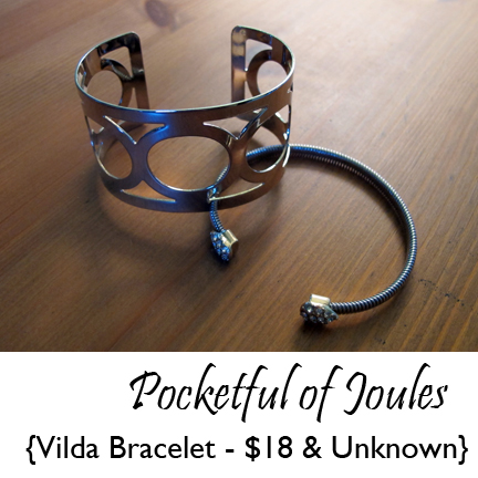 Vilda Bracelet & Unknown Bracelet – The Vilda bracelet is the small one with the rhinestone accents. I really like it and think that it looks pretty both on its own and as part of an eclectic bracelet stack. I usually don’t start wearing bracelets until the weather gets warmer (and you can actually see my wrists), but I think this will be a spring staple for me!