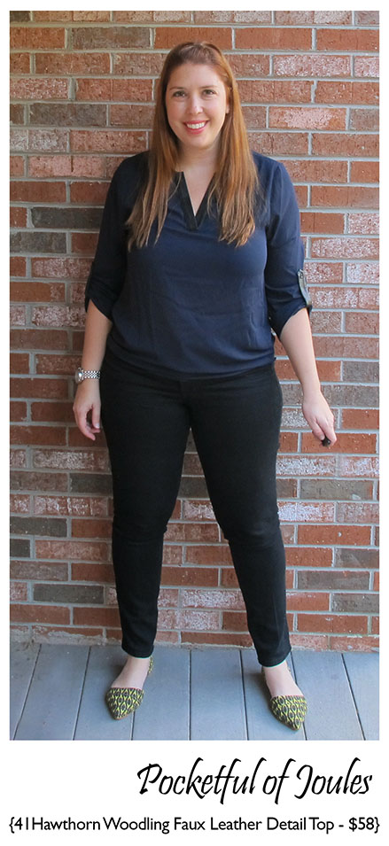 When I first saw this blouse, I was kind of disappointed because I have a similar blouse already – same color, dressy material and tab sleeves. This top has some fun details though with the faux leather around the neckline and also on the sleeve tabs.
