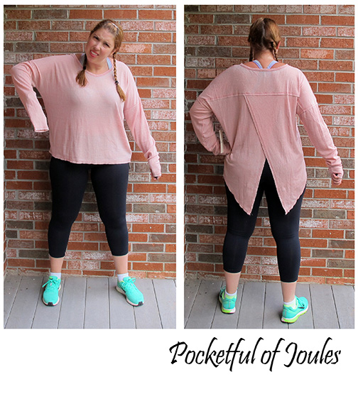 So we go from trying to show off all my goodies to this. Let me just give you a minute to soak this in – the dropped shoulders, super long sleeves and butt wings. That’s right, my butt has wings. I’m literally staring at the picture trying to figure out what to say about this top and I’m at a loss. Hmm… let me think of something nice to say. Um… It’s not too small. Yup, that’s all I’ve got. Also, can you imagine me trying to run in this?
