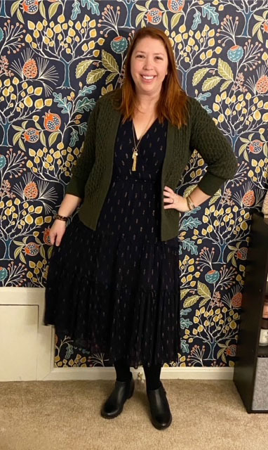 I only went into the Baltimore office three times in February, and apparently, I was all about shades of green. I had that fabulous mossy green Eileen Fisher sweater (from my February Thrift Haul post), a green chunky cardigan and an evergreen velvet blazer that’s been in my closet for 15-20 years.