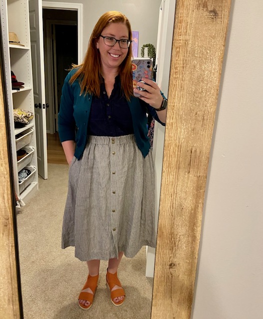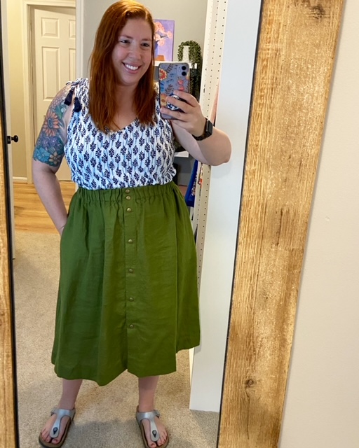 Out of the 11 looks, 5 of them are simple tank tops + skirt combos. Then 2 easy dresses (one of them was worn 2x this month) and a couple cute linen top/sweater + skirt combos. So, all in all a pretty easy formula that I just keep following over and over. I keep it feeling like “me” and not too boring by working in fun colors and patterns. Also, at a quick count at least 14 of the items you see were purchased secondhand.