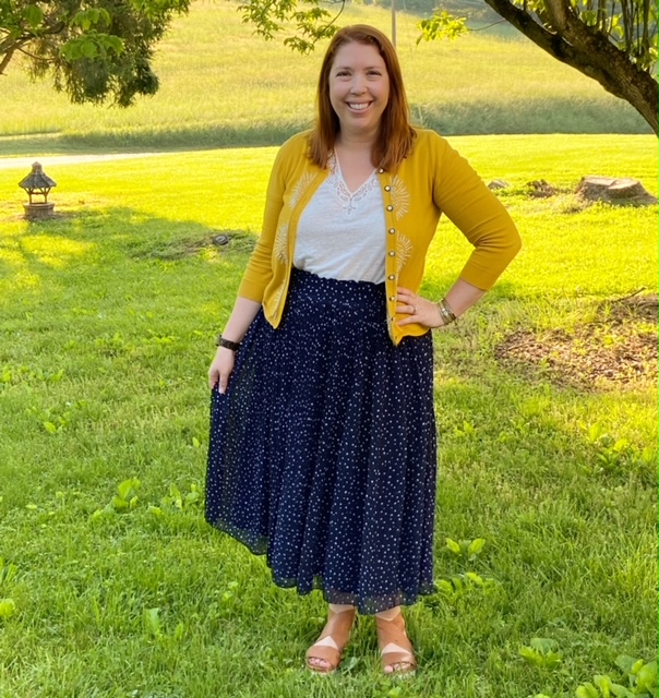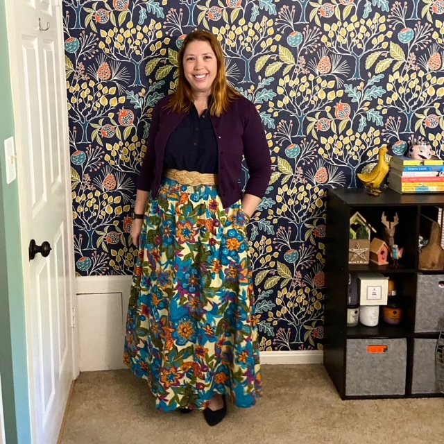 I found this gorgeous linen skirt at TJ Maxx recently and it pretty much jumped into my cart. This is totally going to be on repeat all summer long paired with a graphic tee shirt or solid tank top. However, I figured I’d also style it for work with a straw belt, navy blouse and purple cardigan.