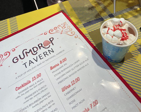 We booked the same kind of room too – a king bed with a pull-out couch, so we had ample space for the three of us. On Saturday, we went to the Gumdrop Tavern, which was a fun holiday themed pop-up. We each got a delicious hot cocoa topped with marshmallows and sprinkles. We also got some snacks to take back to the room (totally don’t do this, it was CRAZY expensive for a couple bags of popcorn and cookies). The cocoa was great though!