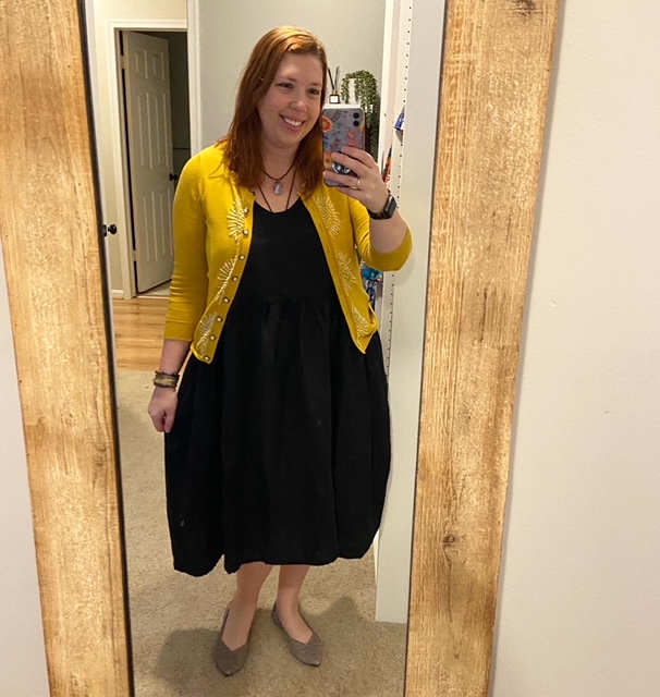 VOLUME Dress in Deepest Black Heavy Linen, XL (I probably could have sized down in this, but this is what I found on Poshmark for a great price and I love how twirly it is!). I love the weight of the heavy linen and this will be super versatile — you can style it over a fitted tank top, over a long sleeved top, or with a cardigan as I did here.