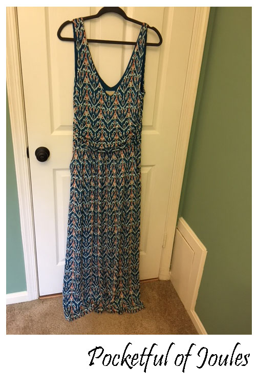 This was on the dresses rack (and marked with a dresses tag, making it $10) and it was a Loft size large with a tie top and drawstring waist. I decided to try it on a whim and was totally surprised that I love it. Of course, I tried it on again when I got home and didn’t love it quite as much… This one is going into the closet for me to try again when it warms up next summer.