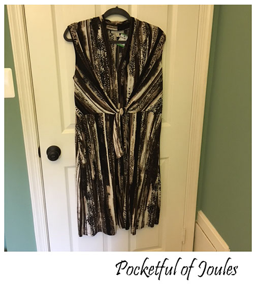 I admit, this dress doesn’t look very exciting on the hanger. I picked it up because I liked the lightweight jersey fabric and the muted color palette of black, brown and cream. I wore it to work earlier this month with a black blazer and my persimmon Rothy’s: