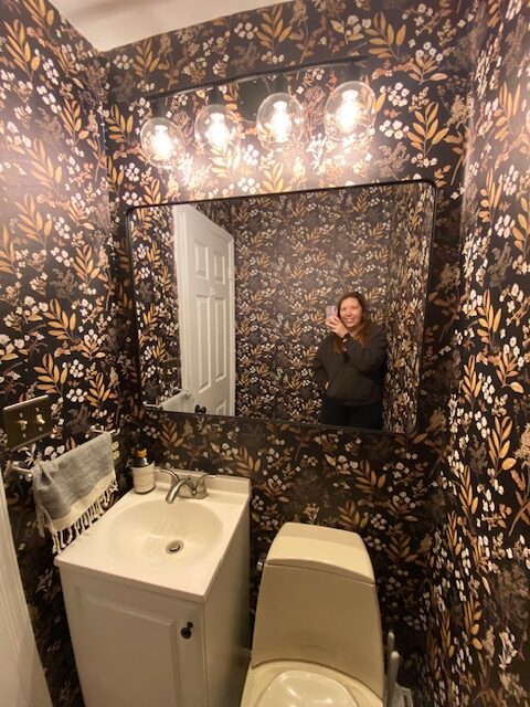 Once I was done with the wallpaper, Travis did 90% of the work to get the new light hung. Then, we added the mirror clips and had to wait a few days for the mirror to come in since the first one they sent arrived broken.
