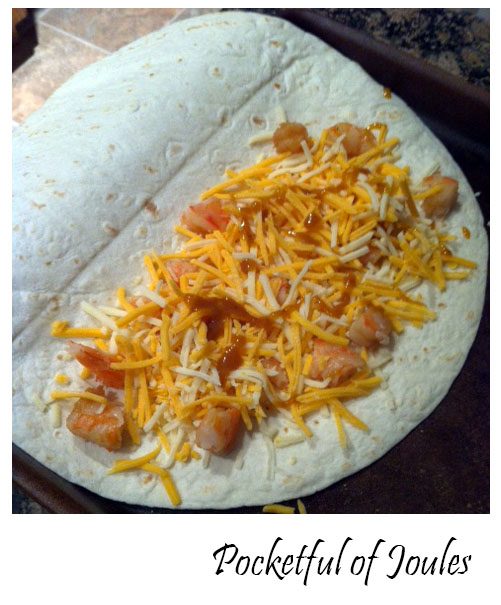 I use shrimp and BBQ sauce in this version, but you can use pretty much anything you have sitting around. Shredded rotisserie chicken, beans and cheese makes a yummy combo. I also like just shredded cheese and a spoonful or two of any salsa. Be creative!