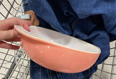 I’m always casually on the hunt for Pyrex, so when I saw this pink bowl, I immediately grabbed it and checked it all over for scratches. I couldn’t believe it was in perfect condition. Pink Pyrex is super popular, so I was shocked to find this out in the wild. It has been added to my Pyrex collection and I love it so much!