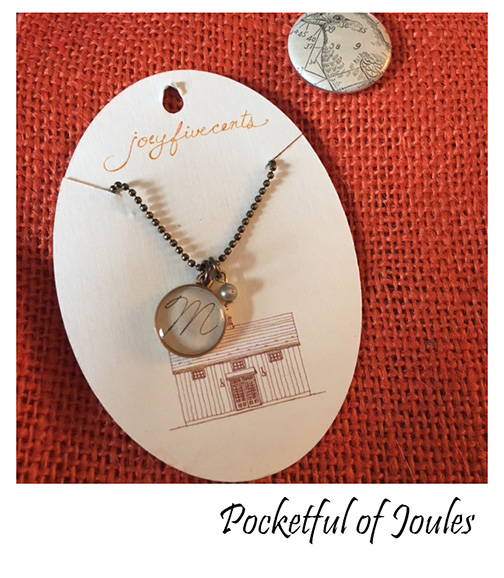 This one is a gift, so if you are a sister of mine… LOOK AWAY! This initial necklace was made using original vintage paper from a Palmer Handwriting practice guide book from the 1930’s and 1940’s. The vintage paper has been sealed and coated with resin and then accented with a tiny vintage pearl bead flourish. My sister is engaged, so I purchased the letter of what will be her new last name!