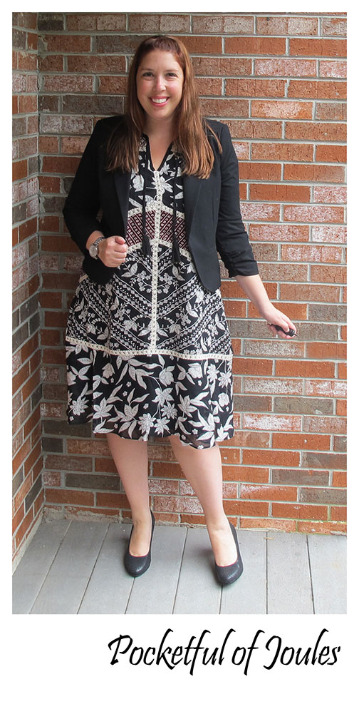 POW! That just happened. By switching out the cardigan for a black fitted blazer, I gave the dress a little more of a nipped in shape at the waist. I also switched the booties for a pair of serious heels and would totally feel confident wearing my fancy muumuu to work for a presentation.