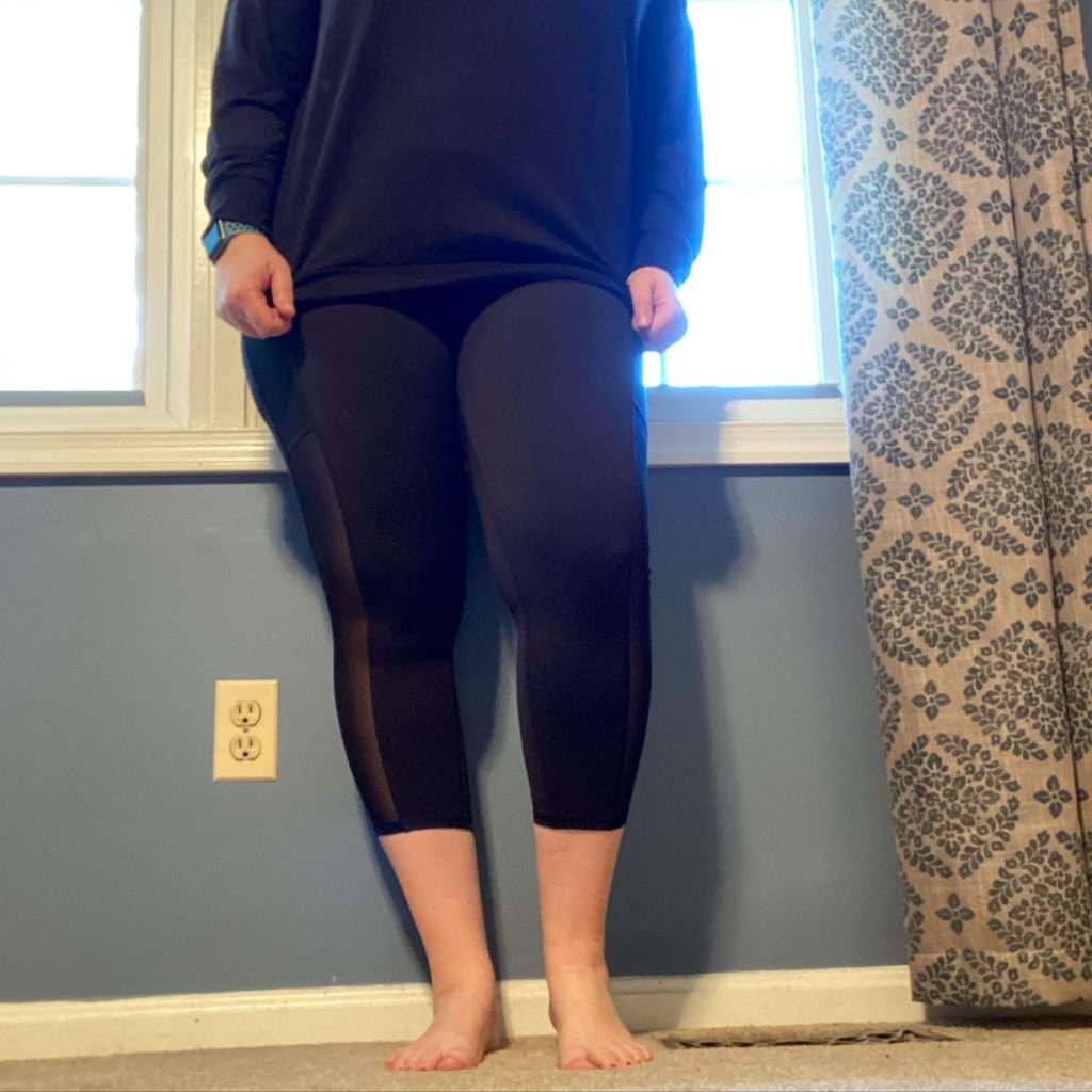 They are high waisted, so they suck my tummy in a bit without being uncomfortable. The mesh isn’t scratchy at all and the fabric is even softer than my favorite pair from Athleta. The size S fit me well, but they are very stretchy so it is possible I could have sized down to an XS. I like to be able to breathe in my leggings though, so I’m happy with the larger size. Throughout the day, they didn’t bag out or start falling down my waist at all.